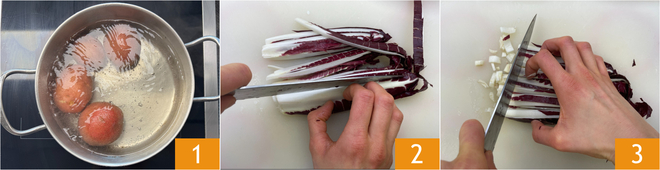 Um die Kartoffeltörtchen mit Spinat und Radicchio zuzubereiten, kochen Sie zuerst die Kartoffeln in kaltem, gesalzenem Wasser für etwa 30-40 Minuten oder bis sie weich sind 1. In der Zwischenzeit kümmern Sie sich um die Füllung: Reinigen Sie den Radicchio und schneiden Sie ihn zuerst in Streifen 2 und dann in Stückchen 3.