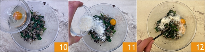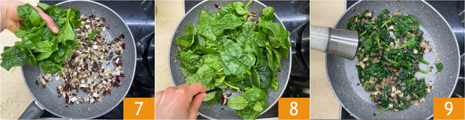 Fügen Sie auch den Spinat hinzu 7 und kochen Sie alles bei mittlerer Hitze für etwa zehn Minuten. Wenn der Spinat zusammengefallen und der Radicchio weich ist, salzen 8 und pfeffern Sie. Geben Sie alles in eine Schüssel und lassen Sie es abkühlen, dann fügen Sie die Eier hinzu 9.