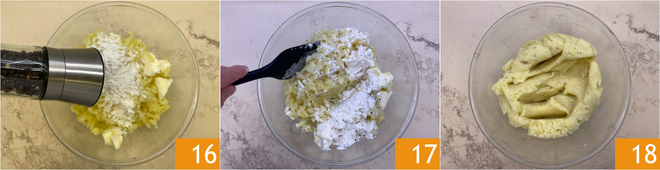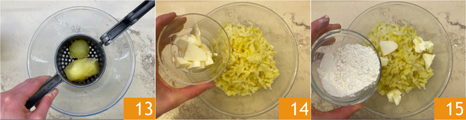 Zu diesem Zeitpunkt sind die Kartoffeln gekocht, also schälen Sie sie und drücken Sie sie mit einem Kartoffelstampfer in eine Schüssel 13. Fügen Sie die Butter 14 und das Mehl hinzu 15.