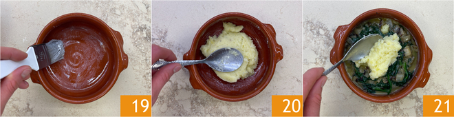 Fahren Sie mit der Zusammensetzung fort: Buttern Sie 4 Terrinen 19 und verteilen Sie die Kartoffelmischung auf dem Boden und den Seiten 20. Gießen Sie die Füllung hinein und bedecken Sie sie mit weiterer Kartoffelmischung, wobei Sie die Ränder gut verschließen 21.