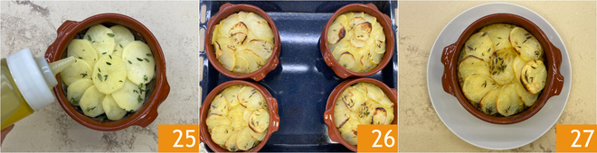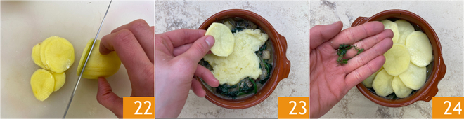 Schälen Sie zu diesem Zeitpunkt die Kartoffeln für die Oberfläche und schneiden Sie sie in Scheiben von 2 mm Dicke 22. Legen Sie die Kartoffeln auf die Törtchen 23, salzen Sie und duften Sie mit Thymianblättern 24.