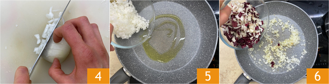 Schälen und hacken Sie die Zwiebel 4. Geben Sie die Zwiebel in eine große Pfanne mit etwas heißem Öl 5 und braten Sie sie einige Minuten an. Sobald die Zwiebel durchsichtig ist, fügen Sie den Radicchio hinzu 6.