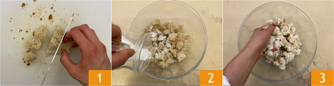Um die Käse-und-Pfeffer-Bällchen mit Fondue zuzubereiten, schneiden Sie zuerst das altbackene Brot grob 1, geben Sie es in eine Schüssel und gießen Sie die Milch darüber 2. Lassen Sie es 10 Minuten einweichen, bis das Brot weich geworden ist. Drücken Sie es gut aus, um die überschüssige Milch zu entfernen 3, und stellen Sie es beiseite.