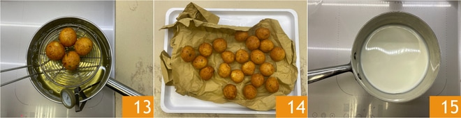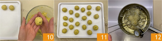 Mit leicht feuchten Händen formen Sie Bällchen mit einem Durchmesser von etwa 4-5 cm 10 und legen Sie diese auf ein Tablett 11. Erhitzen Sie das Pflanzenöl auf 170°C und frittieren Sie wenige Bällchen auf einmal, um die Temperatur des Öls nicht zu sehr abzusenken 12.