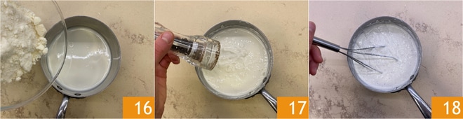 Schalten Sie die Hitze aus, fügen Sie den geriebenen Pecorino Romano hinzu 16 und rühren Sie stetig, bis Sie eine glatte und homogene Creme erhalten. Sollte sie zu dickflüssig sein, können Sie etwas frische Sahne hinzufügen. Pfeffern Sie 17 und rühren Sie erneut 18.