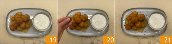 Legen Sie die Bällchen auf eine Servierplatte und servieren Sie sie mit dem Fondue separat 19. Vervollständigen Sie das Gericht mit gehackter Petersilie 20 und einer weiteren Portion frisch gemahlenem schwarzen Pfeffer. Ihre Käse-und-Pfeffer-Bällchen mit Fondue sind bereit zum Genießen 21!