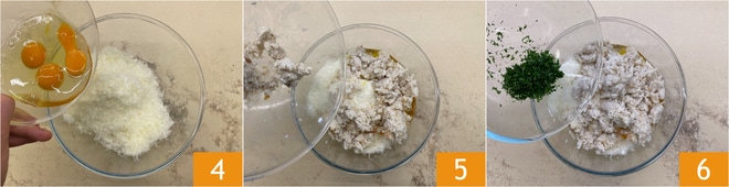 In eine Schüssel geben Sie den Pecorino Romano DOP, fügen die Eier hinzu 4, das Brot 5 und die gehackte Petersilie 6.