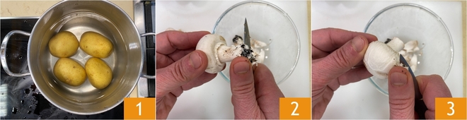 Um die schmelzenden Pilz-Kartoffel-Bällchen zuzubereiten, kochen Sie zunächst die Kartoffeln in kaltem Wasser für mindestens 30-40 Minuten oder bis sie weich genug sind, um sie mit einer Gabel zu durchstechen (die Zeit kann je nach Größe variieren) 1. In der Zwischenzeit reinigen Sie die Pilze mit einem Messer, indem Sie den erdigen Teil der Basis 2 und des Hutes 3 entfernen.