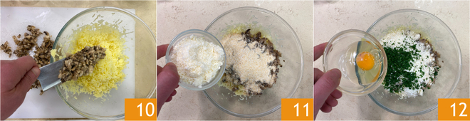 Zu diesem Zeitpunkt sind die Kartoffeln gekocht, also schälen und zerdrücken Sie sie. Fügen Sie die gehackten Pilze 10, Paniermehl, geriebenen Käse 11, gehackte Petersilie und das Ei 12 hinzu.