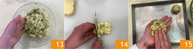 Salzen und pfeffern Sie nach Belieben, dann kneten Sie 13 bis eine homogene Masse entsteht. Schneiden Sie den Provola in Würfel 14 und formen Sie die Bällchen: Nehmen Sie jeweils 50 g der Masse und flachen Sie sie in Ihrer Handfläche ab 15.
