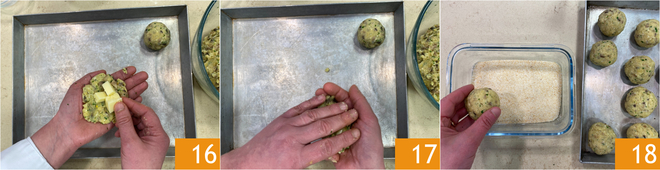 Platzieren Sie in der Mitte etwa 10 g Provola 16, dann schließen Sie das Bällchen und versiegeln die Füllung innen 17. Nachdem alle Bällchen geformt sind (mit diesen Zutaten erhalten Sie etwa 12), wälzen Sie sie in Paniermehl 18.