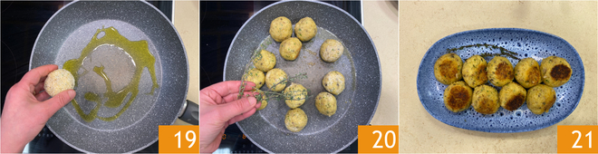 Erhitzen Sie das restliche Öl in einer großen Pfanne, dann legen Sie die Bällchen hinein 19 und fügen die Thymianzweige hinzu. Braten Sie für etwa 10 Minuten bei mittlerer bis hoher Hitze und wenden Sie die Bällchen auf beiden Seiten 20. Servieren Sie Ihre schmelzenden Pilz-Kartoffel-Bällchen noch heiß 21!
