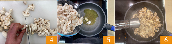 Schneiden Sie die Pilze in dünne Scheiben 4 und geben Sie sie in eine Pfanne, in der Sie 15 g Öl mit einer Knoblauchzehe erhitzt haben 5. Dünsten Sie die Pilze bei mittlerer bis hoher Hitze für etwa 7-8 Minuten und würzen Sie dann mit Salz und Pfeffer 9.