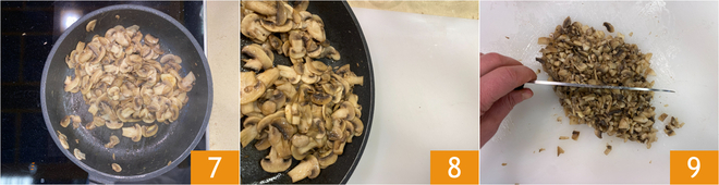 Wenn die Pilze gekocht sind 7, entfernen Sie den Knoblauch, dann geben Sie sie auf ein Schneidebrett 8 und hacken sie mit einem Messer 9.