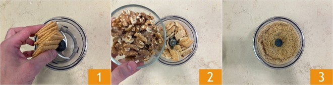 Um den Käsekuchen mit Feigen zuzubereiten, schmelzen Sie zunächst die Butter und lassen Sie sie abkühlen. Geben Sie die Kekse 1 und die Walnüsse 2 in einen Mixer und zerkleinern Sie sie, bis Sie eine sandige Masse erhalten 3.