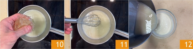 Fügen Sie die gut ausgedrückte Gelatine hinzu 10 und rühren Sie, um sie vollständig aufzulösen 11. Lassen Sie die Mischung abkühlen und geben Sie sie dann in eine Schüssel mit dem Joghurt 12.
