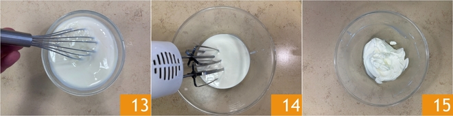 Rühren Sie, bis eine glatte Creme entsteht, und stellen Sie sie dann im Kühlschrank zur Seite. Jetzt schlagen Sie die Sahne mit einem elektrischen Mixer auf 14 15.