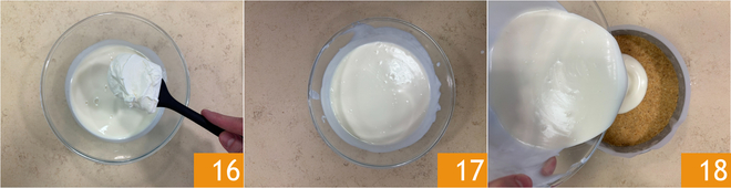 Heben Sie die geschlagene Sahne vorsichtig mit einem Spatel unter die Joghurtmischung 16, und rühren Sie sanft mit Bewegungen von unten nach oben, um die Sahne nicht zu entlüften 17. Nehmen Sie die Form aus dem Kühlschrank und gießen Sie die erhaltene Creme auf den Boden 18.