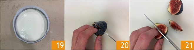Glätten Sie die Oberfläche und lassen Sie sie für mindestens 4 Stunden, besser über Nacht, im Kühlschrank fest werden 19. Kurz bevor Sie den Kuchen aus der Form nehmen, bereiten Sie die Dekoration vor: Schneiden Sie die Feigen in Hälften 20 und dann in Spalten 21.
