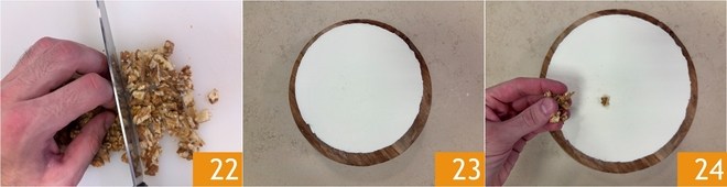 Hacke die Walnüsse grob 22. Sobald der Käsekuchen fest geworden ist, nehmen Sie ihn vorsichtig aus der Form 23 und dekorieren Sie die Oberfläche mit den Walnussstückchen 24.