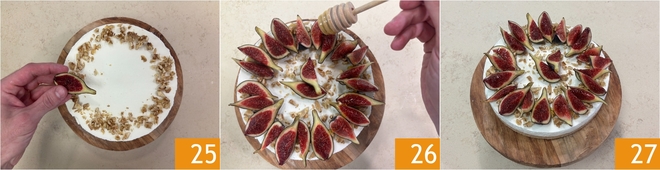 Vervollständigen Sie mit den frischen Feigenspalten 25 und, wenn gewünscht, mit einem Hauch Honig 26. Servieren Sie Ihren selbstgemachten Käsekuchen mit Feigen sofort 27!