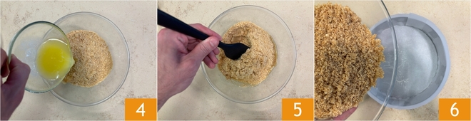 Übertragen Sie die Mischung in eine Schüssel und geben Sie die geschmolzene Butter hinzu 4, dann gut vermischen, um alles zu verbinden 5. Nehmen Sie eine Springform mit einem Durchmesser von 20 cm, legen Sie sie mit Backpapier aus und verteilen Sie die Keksmasse auf dem Boden 6, dabei gut mit dem Rücken eines Löffels andrücken.