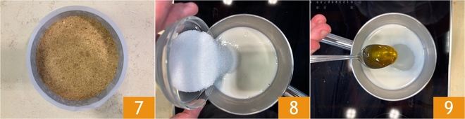 Stellen Sie den Boden für mindestens 20 Minuten in den Kühlschrank, damit er fest wird 7. In der Zwischenzeit weichen Sie die Gelatine in kaltem Wasser ein. Erhitzen Sie in einem kleinen Topf die Milch mit dem Zucker 8 und dem Honig 9.