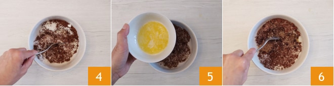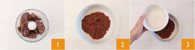 Um den Kokos- und Nutella-Cheesecake zuzubereiten, beginnen Sie damit, eine Springform von 18 cm mit Butter zu fetten und mit Backpapier auszulegen. Fahren Sie fort, indem Sie den Boden vorbereiten: Schmelzen Sie die Butter bei sehr niedriger Hitze, dann zerkleinern Sie die Kekse im Mixer 1, geben Sie das Pulver in eine Schüssel 2 und fügen Sie die Kokosflocken hinzu 3.
