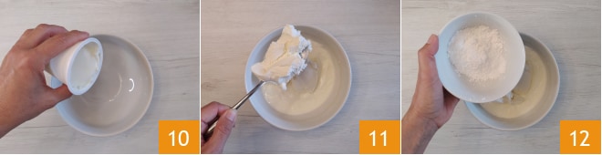 Geben Sie den Kokosjoghurt in eine Schüssel 10, fügen Sie den Frischkäse 11 und den Puderzucker hinzu 12.