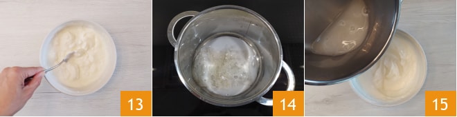 Rühren Sie, um alle Zutaten gut zu vermischen 13. Lassen Sie nun die Gelatine abtropfen und geben Sie sie zusammen mit der Kokosmilch in einen kleinen Topf 14, schmelzen Sie sie bei niedriger Hitze unter ständigem Rühren. Gießen Sie sie auf die Creme 15.