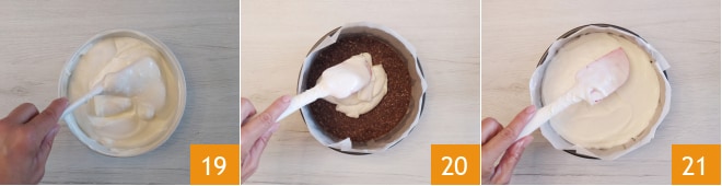 Achten Sie darauf, sie vorsichtig und mit sanften Bewegungen von unten nach oben zu integrieren 19. Geben Sie alles auf den Keksboden 20 und glätten Sie die Oberfläche 21.