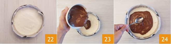 Stellen Sie den Kuchen mindestens 2 Stunden (besser 3 oder 4 Stunden, damit er fest wird) im Kühlschrank 22. Nach dieser Zeit nehmen Sie den Kuchen aus dem Kühlschrank, geben Sie Nutella in eine Schüssel und rühren Sie sie mit einem Löffel, um sie weicher zu machen. Dann verteilen Sie sie auf der Oberseite des Kuchens 23 und verteilen sie gleichmäßig mit dem Rücken eines Löffels 24.