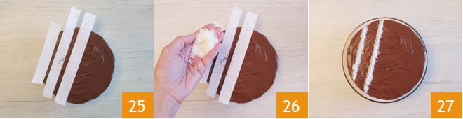 Legen Sie vorsichtig drei kleine Streifen Backpapier, leicht voneinander entfernt, auf einen Rand des Kuchens 25, lassen Sie die Kokosflocken darauf fallen 26 und schon ist Ihr Kokos- und Nutella-Cheesecake bereit 27.