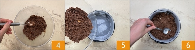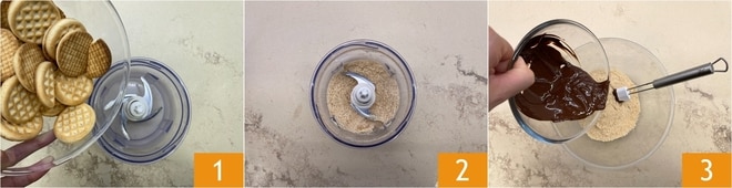 Um den Käsekuchen mit Schokolade und gesalzenem Karamell zuzubereiten, beginnen Sie zuerst mit dem Boden. Geben Sie die Kekse in einen Mixer 1 und mahlen Sie sie zu Pulver 2. Übertragen Sie sie in eine Schale und fügen Sie die geschmolzene Schokolade im Wasserbad oder in der Mikrowelle hinzu 3.