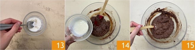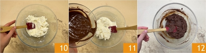 Mischen Sie mit einem Spatel, um sie zu integrieren 10. Schmelzen Sie die Schokolade wie zuvor und fügen Sie sie der Mischung hinzu 11. Mischen Sie, bis sie homogen ist 12.