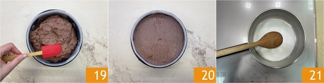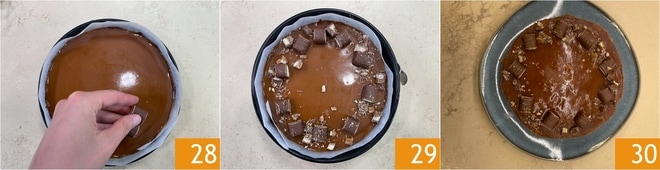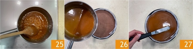 Gut mischen 25 und beiseite stellen. Wenn die Karamellsauce abgekühlt ist, gießen Sie sie auf den Käsekuchen 26. Glätten Sie die Oberfläche nochmals mit einem Spachtel 27.