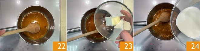 Lassen Sie den Zucker vollständig schmelzen, indem Sie gelegentlich den Topf drehen oder mit einem Holzlöffel rühren 22. Sobald Sie ein bernsteinfarbenes Karamell erhalten haben, fügen Sie die Butter hinzu 23, reduzieren Sie die Hitze und rühren Sie um. Fügen Sie einen halben Teelöffel Salz hinzu und rühren Sie erneut. Sobald es kocht, schalten Sie die Hitze aus. Fügen Sie dann auch die Sahne hinzu, besser wenn sie warm ist 24.
