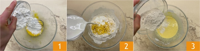 Um die Kastanien-Crepes gefüllt mit Ricotta und Pilzen zuzubereiten, schlagen Sie zuerst die Eier in einer Schüssel auf, fügen eine Prise Salz hinzu und schlagen sie schnell mit einem Schneebesen. Geben Sie das Mehl 00 1 und die Hälfte der Milchmenge 2 hinzu. Rühren Sie, bis das gesamte Mehl eingearbeitet ist. Fügen Sie dann das Kastanienmehl 3 hinzu.
