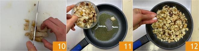 Widmen Sie sich nun der Zubereitung der Füllung. Putzen Sie die Pilze und schneiden Sie sie in Würfel 10. Geben Sie etwas Öl in eine Pfanne, fügen den Knoblauch hinzu und braten ihn einige Minuten an. Wenn der Knoblauch goldbraun ist, fügen Sie die Pilze hinzu 11 und würzen Sie mit Salz 12.