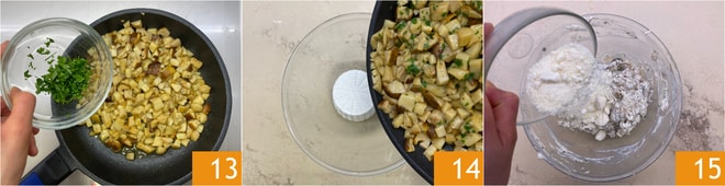 Fügen Sie auch die gehackte Petersilie hinzu 13 und lassen Sie alles 5-7 Minuten kochen, bis die Pilze weich sind. Geben Sie in einer Schüssel die Ricotta, fügen die Pilze 14, den geriebenen Parmesan 15, Pfeffer hinzu und würzen Sie bei Bedarf mit Salz nach.