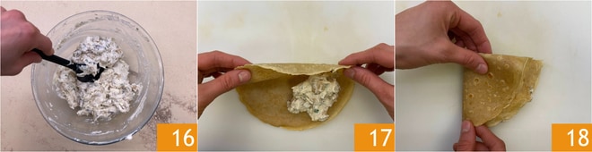Rühren Sie, bis Sie eine homogene Masse erhalten 16. Geben Sie einen Löffel der Füllung in ein Crepe, falten Sie es dann zur Hälfte 17 und erneut zur Hälfte, um eine dreieckige Form zu erhalten 18. Wiederholen Sie den Vorgang, bis alle Crepes aufgebraucht sind.