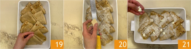 Fetten Sie eine Auflaufform mit Öl ein und legen Sie Ihre Crepes hinein 19. Bestreuen Sie die Oberfläche mit geriebenem Parmesan 20 und fügen kleine Butterwürfel hinzu 21.