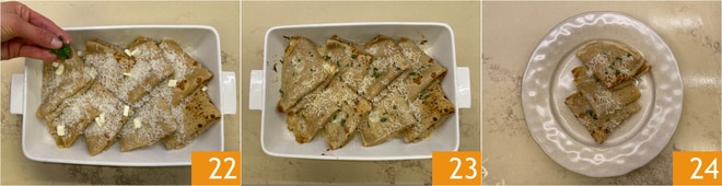 Vervollständigen Sie mit gehackter Petersilie 22 und backen Sie im vorgeheizten Ofen bei 220°C für 10-15 Minuten, bis sie gratiniert sind 23. Richten Sie Ihre Kastanien-Crepes gefüllt mit Ricotta und Pilzen an 24 und servieren Sie sie sofort!
