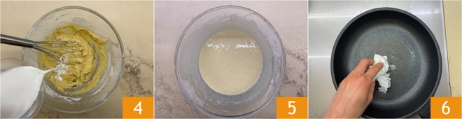 Gießen Sie die restliche Milch 4 hinzu und rühren Sie, bis Sie einen glatten Teig ohne Klumpen erhalten 5. Lassen Sie ihn 30 Minuten im Kühlschrank mit Frischhaltefolie abgedeckt ruhen. Erhitzen Sie eine Antihaft-Pfanne und fetten Sie sie leicht mit etwas Butter ein 6.