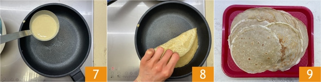 Geben Sie eine Kelle Teig in die Pfanne 7 und backen Sie 1-2 Minuten, bis der Teig goldbraun ist 8, wenden Sie ihn dann und backen Sie die andere Seite. Wiederholen Sie den Vorgang, bis der gesamte Teig aufgebraucht ist. Legen Sie die Crepes auf einen Teller 9 und stellen Sie sie beiseite.