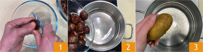 Um die Kastanien- und Radicchio-Crêpes mit Gorgonzola zuzubereiten, beginnen Sie mit dem Kochen der Kastanien: Schneiden Sie die Kastanien mit einem scharfen Messer ein, indem Sie einen Schnitt auf der gewölbten Seite der Schale machen 1. Legen Sie sie in einen Topf mit Wasser und bringen Sie sie zum Kochen 2, lassen Sie sie etwa 20 Minuten kochen, nachdem das Wasser aufgekocht ist. In der Zwischenzeit die Kartoffeln etwa 30 Minuten kochen, oder bis sie weich sind 3.