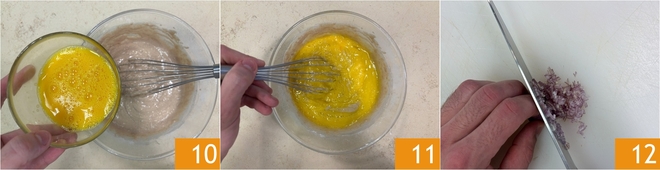 Mit einem Schneebesen zu einem glatten Teig verrühren, dann das verquirlte Ei einarbeiten 10. Alles gut vermischen 11 und den Teig 30 Minuten im Kühlschrank ruhen lassen. In der Zwischenzeit die Füllung vorbereiten: Die Schalotte fein hacken 12.