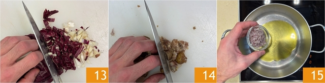 Den Radicchio in Julienne schneiden 13, die gekochten Kastanien grob mit einem Messer zerkleinern 14. Etwas Öl in einem Topf erhitzen und die Schalotte anbräunen lassen 15.