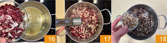 Den Radicchio hinzufügen 16, die Hitze erhöhen und etwa 3 Minuten dünsten lassen, mit Salz und Pfeffer abschmecken 17. Wenn er weich ist, von der Hitze nehmen und die zerkleinerten Kastanien hinzufügen 18.