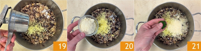 Die zerdrückte gekochte Kartoffel 19, den geriebenen Parmigiano Reggiano 20 und den gehackten Schnittlauch 21 einarbeiten.